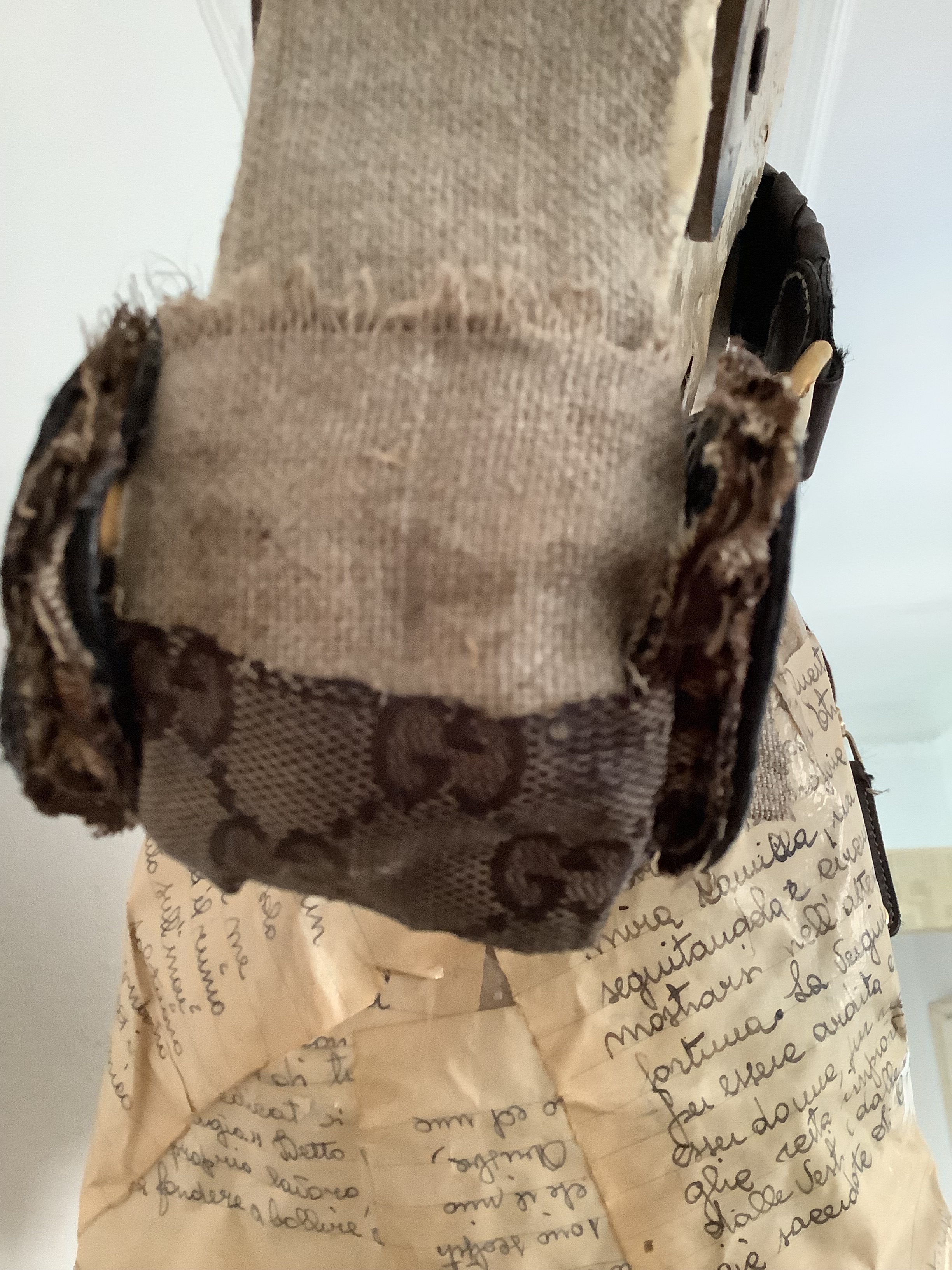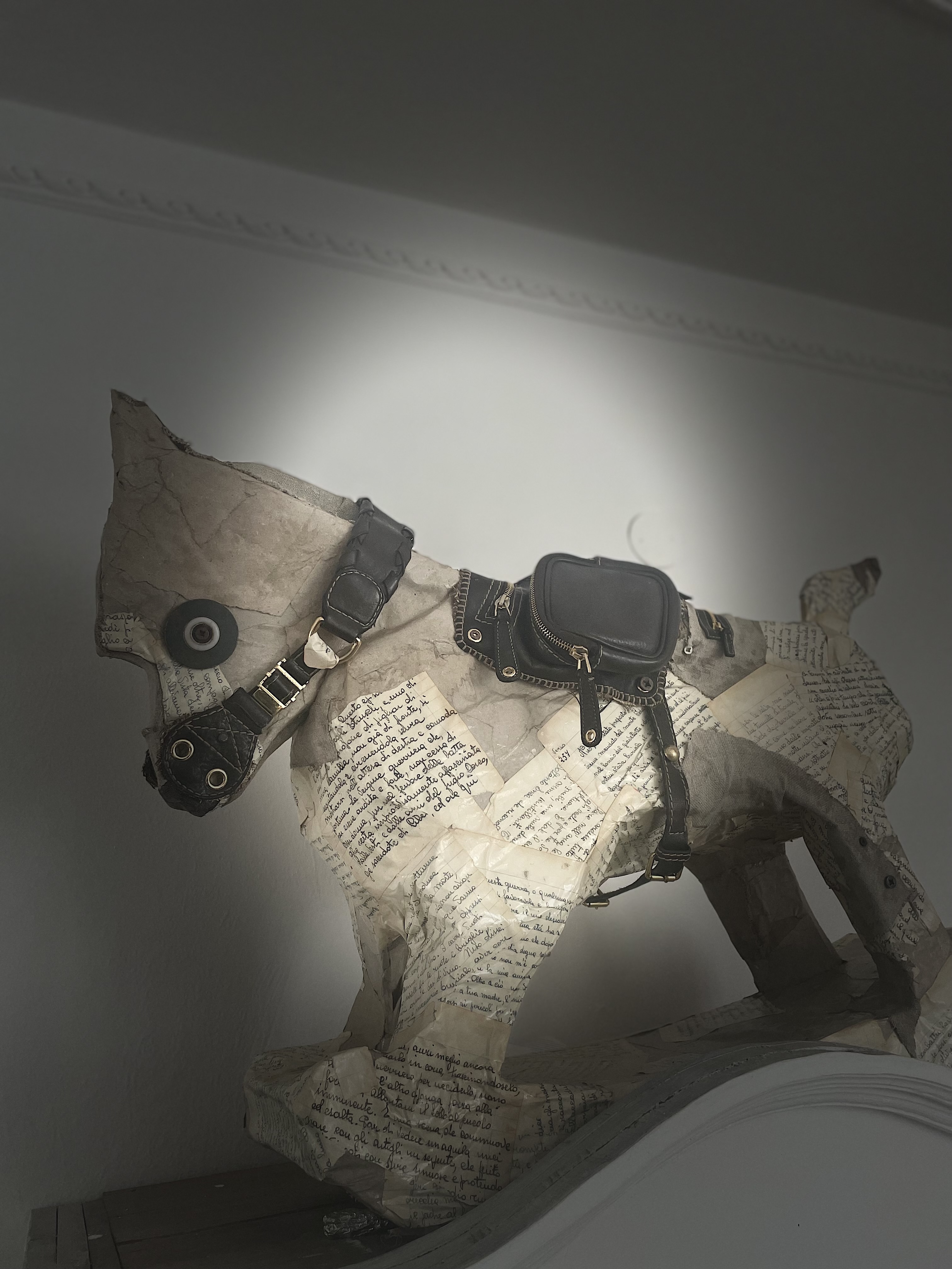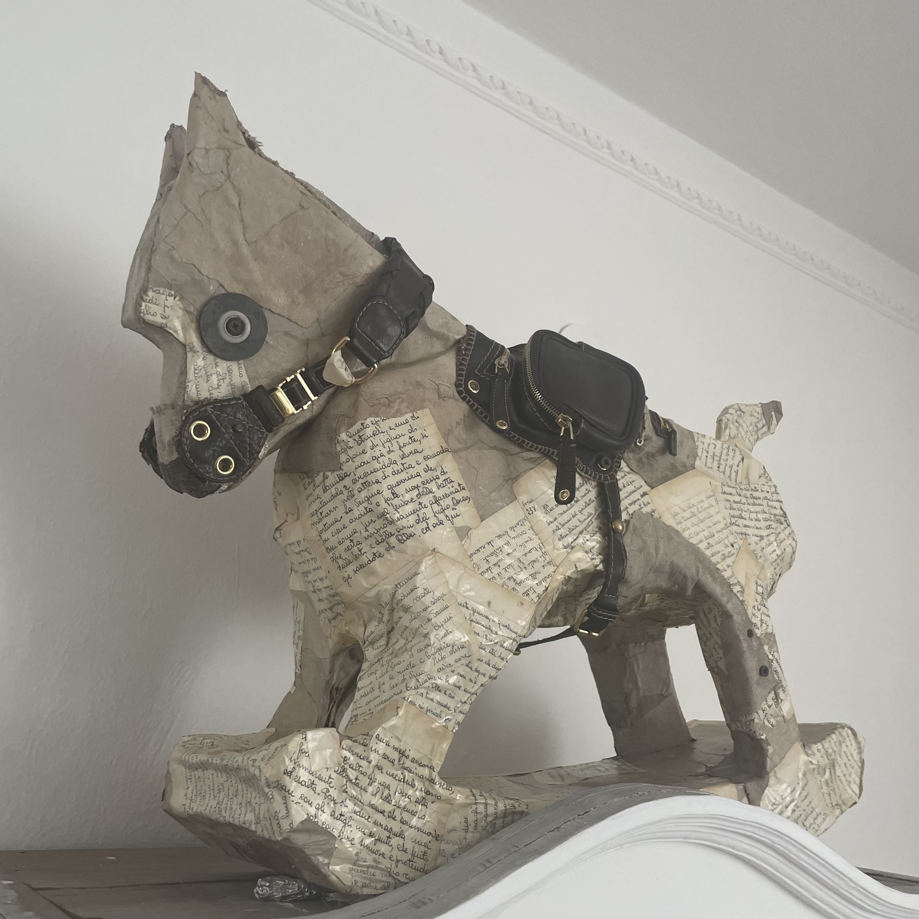 Dopo aver realizzato lo scheletro in cartone, ho rivestito l’intera struttura con pagine provenienti da un vecchio quaderno di scuola di mia madre. Per mettere in risalto le fattezze del cavallo, ho smontato una vecchia borsa di Gucci e, riutilizzando alcuni elementi, ho creato una sella originale e una curiosa musetta.
