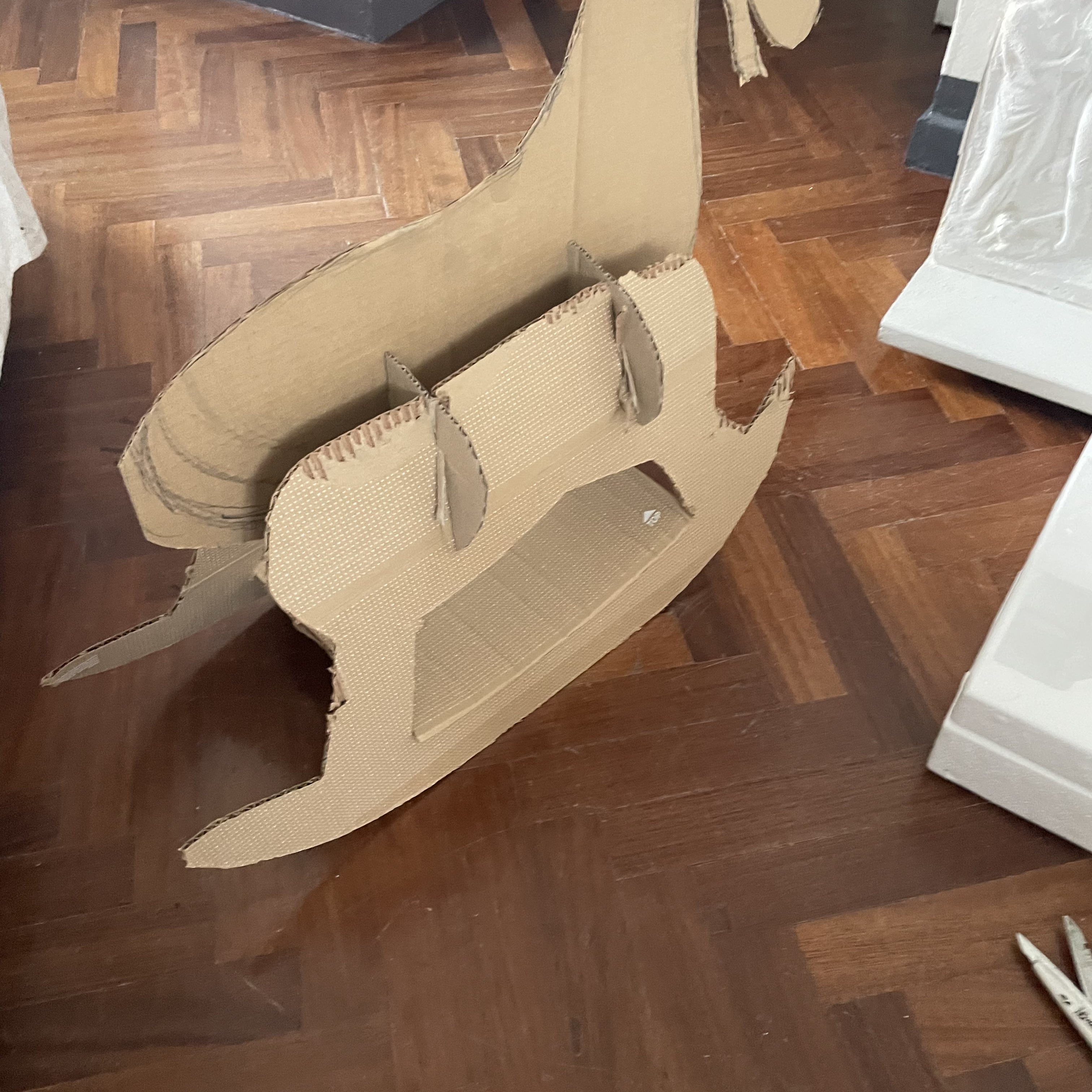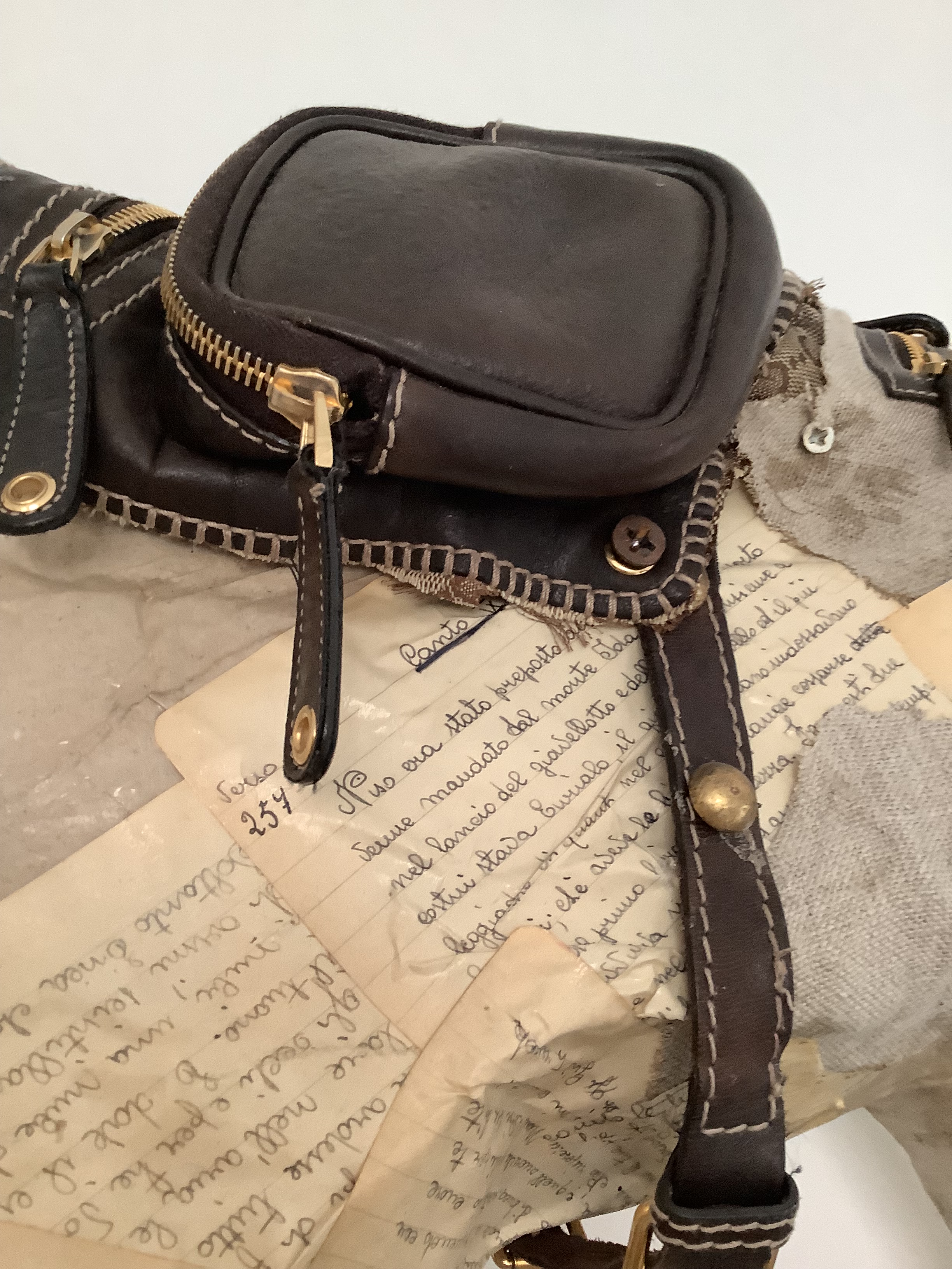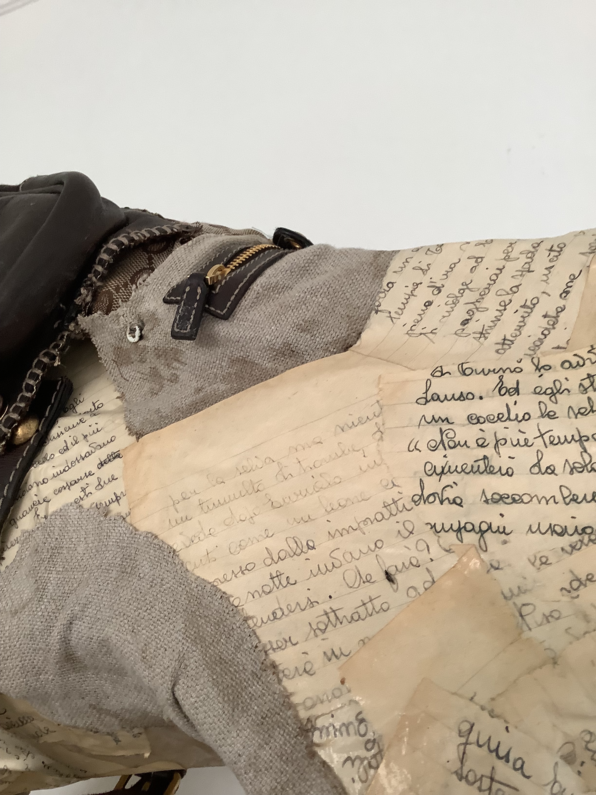 Dopo aver realizzato lo scheletro in cartone, ho rivestito l’intera struttura con pagine provenienti da un vecchio quaderno di scuola di mia madre. Per mettere in risalto le fattezze del cavallo, ho smontato una vecchia borsa di Gucci e, riutilizzando alcuni elementi, ho creato una sella originale e una curiosa musetta.